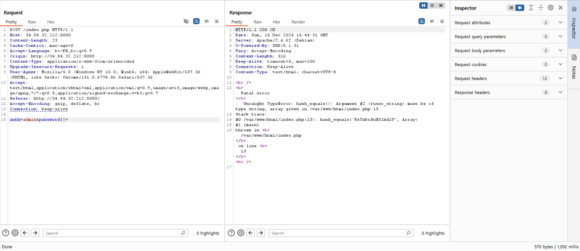 hash_equals 함수에 Array를 삽입하면 $admin_password를 알아낼 수 있다.